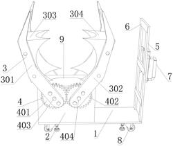2.根据权利要求1所述的一种氢能汽车用氢瓶固定支架,其特征在于:所述动力组件(4)还包括驱动活动柱(403)、从动活动柱(404)、从动锥齿轮(405)、驱动锥齿轮(406)、驱动电机(407)和固定板(408),所述固定板(408)通过螺栓安装在外壳(2)内腔中部,所述固定板(408)顶端中部开设有安装孔,所述驱动电机(407)通过螺栓安装在外壳(2)内腔底端中部,所述驱动电机(407)顶端通过螺栓安装有输出轴,且输出轴穿过安装孔,所述驱动锥齿轮(406)通过螺栓安装在输出轴顶端,所述驱动活动柱(403)通过轴承安装在外壳(2)内腔左侧之间,所述从动锥齿轮(405)通过螺栓安装在驱动活动柱(403)中后侧,所述驱动锥齿轮(406)后端与从动锥齿轮(405)前端相啮合,所述从动活动柱(404)通过轴承安装在外壳(2)内腔右侧之间。