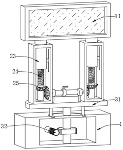 1.一种设计图纸展示装置,包括底座(1)和设置在所述底座(1)上方的展示板本体(11),其特征在于:还包括设置在所述底座(1)和所述展示板本体(11)之间的调节组件(2);