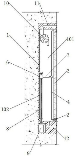 7.根据权利要求1所述的一种便于维修的LED显示屏,其特征在于:所述散热组件包括风机(10)、抽气管(11)以及排气管(12),所述风机(10)安装收纳腔(101)内部左侧面的上端,所述抽气管(11)与风机(10)的出气端插接,并且所述抽气管(11)的顶部从安装框(1)内部的上端贯穿而出,所述排气管(12)插接在收纳腔(101)的内底面,并且所述排气管(12)的底部贯穿出安装框(1)。