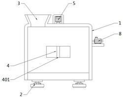 1.一种大米磨粉的碾压粉碎机构,包括研磨机外壳(1),其特征在于:所述研磨机外壳(1)包含齿轮箱(4),所述齿轮箱(4)位于研磨机外壳(1)正面前侧,且齿轮箱(4)内部竖直开设有滑槽(401),所述研磨机外壳(1)底部左右两侧均安装有防震底座(2),所述研磨机外壳(1)上方左侧开设有入料口(3),且入料口(3)底端贯穿于研磨机外壳(1)上表面,所述研磨机外壳(1)中间设置有滤网(9),且滤网(9)上方设置有研磨刀片(7),并且滤网(9)下方设置有研磨石槽(10),所述研磨机外壳(1)上方右侧设置有烘干机(8),且烘干机(8)左侧管道连接于滤网(9)上方空间,所述研磨石槽(10)上方设置有按压环形块(19),且研磨石槽(10)内部设置有研磨棒(12),所述按压环形块(19)前方设置有第一齿轮(15),且第一齿轮(15)左右两侧均齿纹连接有第二齿轮(16),所述第一齿轮(15)前侧设置有直齿条(18),且直齿条(18)连接于滑槽(401)内部,并且直齿条(18)后端固定连接安装于按压环形块(19)正面。