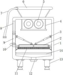 1.一种垃圾场老龄填埋渗滤液处理装置,包括箱体(1)、挤压室(4)和投料口(6),其特征在于:所述箱体(1)的内部安装有挤压室(4),所述挤压室(4)的内部安装有挤压磨轮(5),所述箱体(1)的内壁两侧旋转安装有挤压伸缩杆(3),所述箱体(1)的内部两侧且位于挤压伸缩杆(3)的下方旋转安装有挤压板(2),所述挤压伸缩杆(3)的顶端与挤压伸缩杆(3)的外壁铰接,所述箱体(1)的顶部安装有投料口(6),且投料口(6)与挤压室(4)相连通。