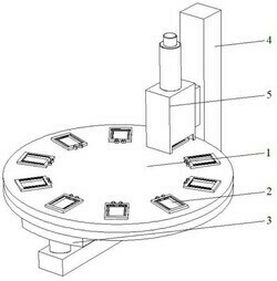 1.一种半导体测试装置,包括测试台(1)和支架(4),其特征在于,所述支架(4)整体呈L型,所述支架(4)内侧壁上安装有测试机箱(5),所述测试机箱(5)的底部位于所述测试台(1)的顶部,所述测试台(1)整体呈圆盘状,且所述测试台(1)顶部均匀设置有多个芯片定位机构(2),所述支架(4)的下部结构和所述测试台(1)之间安装有换位驱动机构(3)。