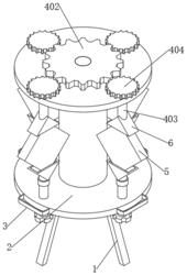 1.一种钢化玻璃展示架,其特征在于,包括底架(1)和钢化玻璃展品(5),所述底架(1)的顶面转动安装有转盘(2),所述底架(1)的底面和转盘(2)顶面设置有用于对钢化玻璃展品(5)进行旋转的转动机构(4),所述转动机构(4)的表面和底架(1)的内侧底部设置有用于对钢化玻璃展品(5)进行固定的固定机构(6),所述转动机构(4)包括电动机(401),所述底架(1)的底面固定安装有电动机(401),所述电动机(401)的输出端贯穿底架(1)的底面固定安装有转动轴且转动轴的自由端固定安装有第一齿轮(402),所述转盘(2)的顶面转动插接有连接轴(403),所述连接轴(403)的顶端固定安装有第二齿轮(404),且第二齿轮(404)和第一齿轮(402)呈啮合安装设置,所述固定机构(6)包括第一卡块(601),所述连接轴(403)的底端固定安装有第一卡块(601),且第一卡块(601)的内部设置有第一橡胶套(602),所述底架(1)的底部螺纹插接有螺纹杆(603),所述螺纹杆(603)的底端固定安装有旋钮(604),所述旋钮(604)的顶面转动安装有第二卡块(605),且第二卡块(605)的内部设置有第二橡胶套(606)。