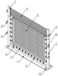 所述隔离组件包括安装于固定座(1)顶部两侧的支撑架(2),两个所述支撑架(2)的内侧设置有隔离框(3),所述隔离框(3)的内侧固定安装有隔离网(6),所述固定座(1)与支撑架(2)的内侧均等距安装有连接扣(4),所述连接扣(4)与隔离框(3)之间均连接有连接弹簧(5),两个所述支撑架(2)的顶部均安装有通电架(7),两个所述通电架(7)的内侧之间通过电线连接有防翻电网(8),所述固定座(1)的内部四个拐角处均开设有安装孔(13);