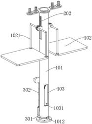 1.一种电网规划装置,其特征在于,包括:安装机构(1);所述安装机构(1)包括有主体(101)、顶槽(1011)和底槽(1012),所述主体(101)为圆柱状结构,且主体(101)顶部设有电线搭接架;所述顶槽(1011)开设在主体(101)的内部上端,且顶槽(1011)贯穿主体(101)的两侧;所述底槽(1012)开设在主体(101)的底部外侧;所述安装机构(1)上设有升降组件(2),升降组件(2)的升降杆(201)滑动安装在主体(101)的内侧,且升降杆(201)外端的顶部件(202)滑动安装在主体(101)上端的顶槽(1011)中,且顶部件(202)上的齿条与主体(101)外侧连接杆(1021)上的齿轮传动连接,并且升降杆(201)底侧的旋转件(203)转动安装在主体(101)内的内槽(103)中;所述安装机构(1)上设有外接组件(3),外接组件(3)的连接件(301)卡合在主体(101)下端的底槽(1012)中,且连接件(301)内的定位孔(3011)与主体(101)内升降件(1031)底侧的圆形杆相卡合。