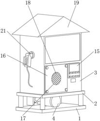 1.一种带有温度监测的充电桩,包括底板(1)和第二转杆(8),其特征在于:所述底板(1)的顶部固定连接有支撑架(2),所述支撑架(2)的顶部固定连接有充电桩本体(3),所述底板(1)顶部的中心处固定安装有电机(4),所述电机(4)的输出端固定连接有第一转杆(5),所述第一转杆(5)的表面固定连接有主皮带轮(6),所述第二转杆(8)的表面固定连接有副皮带轮(9),所述主皮带轮(6)和副皮带轮(9)的表面通过皮带本体(7)传动连接,所述第二转杆(8)的一端固定连接有扇叶(10),所述充电桩本体(3)内腔顶部的一侧固定连接有温度传感器(13),所述充电桩本体(3)表面的一侧固定连接有PLC控制器(15),所述充电桩本体(3)的背面固定连接有防护罩(20),所述充电桩本体(3)的两侧均通过电线电性连接有充电枪(21),所述充电桩本体(3)表面的一侧设有防护壳(16),所述防护壳(16)与充电桩本体(3)之间通过限位螺栓固定连接,所述防护壳(16)的表面开设有散热口(17),所述散热口(17)的内腔设有防尘网(18),所述充电桩本体(3)内腔底部的一侧固定连接有供电箱(11),所述供电箱(11)的内腔设有蓄电池(12),所述充电桩本体(3)的内腔设有电器元件(14),所述充电桩本体(3)表面的顶部固定连接有显示屏,所述充电桩本体(3)的顶部固定连接有遮雨盖(19),所述遮雨盖(19)的形状为三角形。
