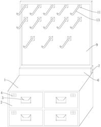 1.一种医疗耗材存放架,包括底座(1),其特征在于:所述底座(1)前侧规则设置有抽屉(2),抽屉(2)内设置有十字隔板(5),底座(1)顶部后侧设置有连接座(6),连接座(6)上端中部设置有滑槽(7),滑槽(7)内设置有立板(9),立板(9)底部具有与滑槽(7)配合的连接板(8),立板(9)前侧壁设置有连接槽(10),连接槽(10)内铺设有铁制连接板,连接槽(10)内设置有连接块(11),连接块(11)后侧设置有与连接板磁吸作用的磁吸块(12),连接块(11)远离磁吸块(12)前侧壁上设置有挂杆(13)。