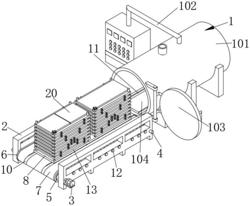 1.一种木材干燥窑上料装置,其特征在于,包括设置在干燥窑设备(1)前侧的上料装置支架(2):所述干燥窑设备(1)包括干燥窑主体(101)、运行装置(102)、窑门(103)和基座(104),所述上料装置支架(2)右侧的前侧固定安装有电机(3),所述上料装置支架(2)内腔的前后均转动连接有转动柱(4),前侧的转动柱(4)的右端与电机(3)的输出轴固定连接,所述转动柱(4)表面的两侧均固定连接有链轮(5),前后相对两个链轮(5)的表面传动连接有链条(6),两个链条(6)之间焊接有连接板(7),所述连接板(7)的顶部设置有底座(8),所述底座(8)的底部安装有多个自锁轮(9),所述连接板(7)的表面开设有与自锁轮(9)相卡合的卡槽(10),所述基座(104)的顶部开设有与自锁轮(9)相适配的滑槽(11),所述底座(8)顶部的前后均设置有多个放置架(13),所述底座(8)右侧的前侧与中间均转动连接有螺纹杆(14),所述螺纹杆(14)贯穿至最顶部放置架(13)的顶部,所述底座(8)的顶部固定连接有多个导向杆(15),所述放置架(13)的顶部放置有木材(20)。