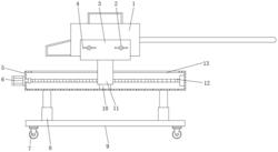 1.一种木材砍伐设备,其特征在于:包括基座(9),所述基座(9)的顶端安装有电动推杆(8),所述电动推杆(8)的输出轴的端面固定连接有固定板(5),所述固定板(5)的一侧安装有电机(6),所述电机(6)的输出轴穿设至固定板(5)的内部并且通过联轴器固定连接有丝杠(12),所述丝杠(12)上螺纹连接有滑块(11),所述滑块(11)的顶端固定连接有安装架(3),所述安装架(3)的内部安装有电锯(1),所述安装架(3)的两侧均螺纹穿设有加长螺杆(2),所述加长螺杆(2)与电锯(1)的机身相抵接。