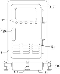 7.根据权利要求1所述的一种便于通风散热结构的有源滤波器,其特征在于,所述装置壳体(1)的正面铰接有柜门(119),所述柜门(119)的正面固定连接有把手(120),所述柜门(119)的正面下方开设有第二排风口(121),所述柜门(119)的正面安装有控制按钮(122),所述控制按钮(122)设置有五个。