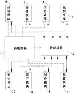5.根据权利要求4所述一种温度监控设备,其特征在于:所述温度监控设备包括有调节模块(9),所述调节模块(9)与制冷模块(8)保持通信,通过向调节模块(9)手动输入温度数值或者通过报警模块(7)启动带动调节模块(9)启动,根据调节模块(9)的启动来控制制冷模块(8)的运行或者停止运行。