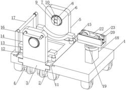 1.一种建筑工程电路铺设用排线结构,包括承载底板(1)、用于放置线缆辊的支撑轴(7),其特征在于:所述承载底板(1)板体前侧面靠左位置开设有插槽(2),所述插槽(2)内部设置有插板(3),所述插板(3)上表面前端位置形成有安装板(5),所述安装板(5)上嵌设有连接轴承(6),所述连接轴承(6)内部安装有支撑轴(7),所述支撑轴(7)上开设有纵向的放置槽(8),所述放置槽(8)中部固定安装有双向伸缩缸(9),所述双向伸缩缸(9)两端部固定安装有弧形顶块(10),所述安装板(5)前侧面上方形成有第一扶手(16),所述安装板(5)下表面安装有万向轮(4)。