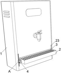 1.一种快速拆装过滤盒的开水器,包括开水器本体(1),其特征在于:所述开水器本体(1)的底端连接有过滤盒(2),且过滤盒(2)内设置有滤水板(3),所述滤水板(3)的底部两端均固定有固定杆,且两个固定杆的底部固定连接有刮板(20),所述刮板(20)配合连接在过滤盒(2)内,所述开水器本体(1)的底端设置有连接机构(4),所述过滤盒(2)通过连接机构(4)与开水器本体(1)连接。