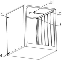 1.一种自清洁型桑拿房,包括清洁桑拿房(1),其特征在于:所述清洁桑拿房(1)的两侧顶端均滑动设置有内壁清洁刷(2),所述清洁桑拿房(1)的内底壁一端薄壁内开设有电机腔(3),所述电机腔(3)内设置有用于所述内壁清洁刷(2)上升或下降的内壁清洁驱动组件(4),所述清洁桑拿房(1)的内顶壁设置有顶壁清洁组件(5),所述顶壁清洁组件(5)与所述内壁清洁刷(2)之间相联动,所述清洁桑拿房(1)的两侧内壁均开设有排水槽(6)。