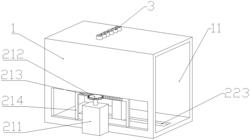 所述移动组件(21)包括:电机(211)、齿轮(212)、齿条(213)、固定架(214)和固定板(215),所述载物组件(22)包括:载件台(221)、支撑架(222)、滑槽(223)和挡板(224),其中,所述挡板(224)包括开合面(2241)和固定面(2242),