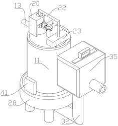所述储存机架(28)内固定设有电磁阀门(31),所述主箱体(11)前侧设有处理机架(35),所述处理机架(35)下端面固定设有传输管(32)且刚好罩住所述电磁阀门(31),所述处理机架(35)内设有过滤腔(38),所述过滤腔(38)内固定设有主抽水泵(33);