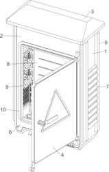 封堵机构(6)包括有转动座(60)、理线板(61)、第二连接件(62)、导向座(63)、推动杆(64)、第一弹簧(65)和挤压件(66),安装架(1)下侧转动式连接有转动座(60),转动座(60)前部连接有理线板(61),转动座(60)左侧连接有第二连接件(62),安装架(1)左下部内侧连接有导向座(63),导向座(63)上滑动式连接有推动杆(64),推动杆(64)与第二连接件(62)挤压配合,推动杆(64)穿过前框(2),推动杆(64)与导向座(63)之间连接有第一弹簧(65),箱门(4)左部下侧连接有挤压件(66),在箱门(4)旋转关闭会带动挤压件(66)移动至推动杆(64)的前侧并挤压推动杆(64)向后移动,第一弹簧(65)受到挤压收缩,进而使得推动杆(64)推动第二连接件(62)的上部向后摆动,从而使得转动座(60)旋转,带动理线板(61)旋转,使得理线板(61)将线缆压紧在安装架(1)上,打开箱门(4)时,挤压件(66)脱离推动杆(64),第一弹簧(65)回弹,使得推动杆(64)复位,通过重力作用使转动座(60)复位,使得理线板(61)不再压紧线缆,便于进行检修。