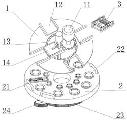 1.一种玻璃载板激光质量检测系统,应用于玻璃载板的质量检测,其特征在于,包括位于上部的质量检测装置(1)、位于下部的旋转支撑装置(2),以及安装于质量检测装置(1)上的拆卸式激光模块(3),拆卸式激光模块(3)朝向旋转支撑装置(2)上的载波玻璃进行激光检测,其中:质量检测装置(1),包括圆环状的安装座,安装座的内环设置齿轮组(13),齿轮组(13)包括与驱动电机(11)相连的齿轮Ⅰ、与安装座内环周缘的齿轮Ⅱ;齿轮Ⅰ与齿轮Ⅱ相互啮合从而带动安装座旋转;安装座的外环周缘开设有若干快拆口(12),快拆口(12)呈矩形槽状设置,其上安装有拆卸式激光模块(3);安装座的内环还设置有配合拆卸式激光模块(3)顶出的电动推杆(14);