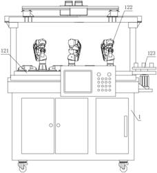 1.基于工业场景的互联网实训平台,包括实训台(1),其特征在于:实训台(1)表面分别安装有控制面板(11)、生产加工模拟平台(12)和监测传感器(13),控制面板(11)一侧设置有控制键(14),控制面板(11)基于物联网与生产加工模拟平台(12)和监测传感器(13)进行数据交互,生产加工模拟平台(12)表面分别设置有加工生产线(121)、机械臂(122)和转台流转装置(123);