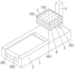 1.一种快捷批量照射鸡蛋的麻黄鸡苗孵化用筛选装置,包括装置主体(1),其特征在于,所述装置主体(1)包括放蛋机构(5)、照射机构(6)和接收机构(7),所述放蛋机构(5)包括放蛋板(501),所述放蛋板(501)的一侧固定安装有电动伸缩杆(503),所述照射机构(6)包括安装板(601),所述安装板(601)的一侧固定安装有多组照射灯(602),所述接收机构(7)包括安装架(701),所述电动伸缩杆(503)的伸缩端与所述安装架(701)固定连接,所述安装架(701)的内部安装有接收板(703)。