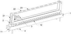 1.一种检测试管胶塞玻璃管组合,包括第一输送线(1)和第二输送线(2),所述第二输送线(2)固定安装于第一输送线(1)上方,且所述第一输送线(1)和第二输送线(2)相互平行,其特征在于:所述第一输送线(1)上设有第一输送带(11),所述第一输送带(11)外侧面间隔设有挡板(12),所述第二输送线(2)包括转接架(21)和第二输送带(22),所述第二输送带(22)上间隔设有支撑组件(23),所述第二输送带(22)上开设有用于支撑组件(23)穿插的通孔,所述第一输送线(1)边侧固定安装有压紧机构(3)和限位机构(4),所述限位机构(4)和压紧机构(3)上下对向设置。