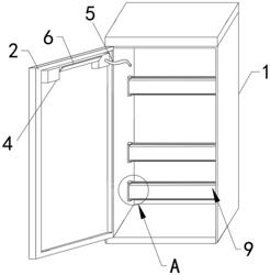 4.根据权利要求1所述的安全性高的综合配电箱,其特征在于:所述挡板(6)呈倾斜设置,且测电笔(7)的笔尖抵在挡板(6)的内壁上,测电笔(7)的氖泡部位贯穿固定座(4)和箱门(2)延伸至亚克力面板(3)的内部。