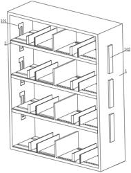 1.一种酒店家具组装连接构件,包括书柜本体(1)和连接螺栓(3),其特征在于:所述书柜本体(1)内部滑动连接有多个横隔板(2),所述书柜本体(1)内部相对两侧分别固定连接有多个L型调节盒(101)和多个滑动盒(102),所述L型调节盒(101)内部侧面通过轴承转动穿设有第一转轴(103),所述第一转轴(103)表面固定连接蜗杆(104),所述第一转轴(103)一端固定连接有旋钮(105),所述L型调节盒(101)内部顶端通过轴承转动连接有第二转轴(106),所述第二转轴(106)表面固定连接有蜗轮(107),所述蜗杆(104)与蜗轮(107)相互啮合,所述第二转轴(106)底端固定连接有螺纹杆(108),所述螺纹杆(108)轴端转动连接在L型调节盒(101)内部底端固定连接的轴承内,所述L型调节盒(101)侧面开设有通孔(109),所述螺纹杆(108)表面螺纹连接有活动板(1010),所述滑动盒(102)内部固定连接有滑动杆(1011),所述滑动杆(1011)表面滑动连接有滑动板(1012),所述横隔板(2)底部开设有两个连接槽(204),所述活动板(1010)侧面滑动穿过通孔(109),并且通过连接螺栓(3)固定在连接槽(204)内,所述滑动板(1012)侧面滑动穿过滑动盒(102),并且通过连接螺栓(3)固定在连接槽(204)内。