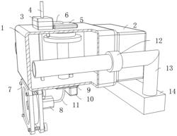 1.一种智能调节粮仓通风除湿装置,包括外壳体(1),其特征在于:所述外壳体(1)表面一侧固定连接有备用电池组(2),所述外壳体(1)顶部一侧固定连接有电源开关(3),所述电源开关(3)顶部固定连接有第一连接线路(4),所述外壳体(1)顶部靠近电源开关(3)的位置固定连接有电磁机构(5),所述电源开关(3)靠近电磁机构(5)的一侧固定连接有第二连接线路(6),所述第二连接线路(6)远离电源开关(3)的一侧固定连接在电磁机构(5)顶部一侧,所述外壳体(1)底部一侧固定连接有通风扇(7),所述通风扇(7)表面一侧固定连接有伺服电机(8),所述外壳体(1)底部靠近通风扇(7)的一侧固定连接有备用电源控制盒(9),所述备用电源控制盒(9)远离外壳体(1)的一侧固定连接有警报音箱(10),所述备用电源控制盒(9)位于固定连接警报音箱(10)的一侧表面固定连接有第三连接线路(11),所述第三连接线路(11)远离备用电源控制盒(9)的一侧固定连接在伺服电机(8)的一侧,所述外壳体(1)位于固定连接备用电池组(2)相邻两侧表面均固定连接有固定套环(12),所述固定套环(12)内部固定套接有负压管道(13),所述负压管道(13)底部一端固定连接有矩形除湿盒(14),所述备用电池组(2)底部固定连接有第四连接线路(15),所述第四连接线路(15)远离备用电池组(2)的一侧固定连接在备用电源控制盒(9)表面一侧。