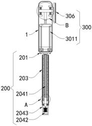 1.一种手持式振动毛刷,包括驱动箱(1),其特征在于:所述驱动箱(1)的一侧上安装有调节伸缩机构(200)以及安装在所述驱动箱(1)内的振动清洁机构(300),且所述调节伸缩机构(200)是用以调节振动清洁机构(300)清洁时的长度,所述振动清洁机构(300)是用以自动化清理污渍;