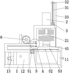 1.一种建筑结构承载力的检测装置,包括装置底座(1)与液压缸(2),其特征在于:所述装置底座(1)的下方一侧插接有废料室(11),且装置底座(1)的另一侧安装有集灰室(12)与抽尘机(13),所述装置底座(1)的两侧安装有集尘罩(15),且集尘罩(15)上连接有连通管道(16),所述连通管道(16)的下方与集灰室(12)连通,所述液压缸(2)安装于装置底座(1)的上方,且液压缸(2)的下方连接有加压垫块(21),所述装置底座(1)的上方安装有驱动电机一(3),且驱动电机一(3)的上方连接有导向丝杆(31),所述导向丝杆(31)上安装有滑块(32),且滑块(32)的外侧焊接有亚克力挡板(33),所述装置底座(1)的两侧螺纹连接有螺纹杆(4),且螺纹杆(4)的前端活动连接有夹持垫块(41),所述装置底座(1)的中间部位安装有驱动电机二(5),且驱动电机二(5)的输出端连接有主动齿轮(51),所述主动齿轮(51)上啮合连接有齿条(52),且齿条(52)的上方安装有置物板(53),所述装置底座(1)上方安装有抽风扇(6),且抽风扇(6)的下端连通有清理风道(61),所述装置底座(1)内靠近液压缸(2)的位置安装有超声波检测仪探头(18),且装置底座(1)内靠近置物板(53)的位置安装有刷板(17)。