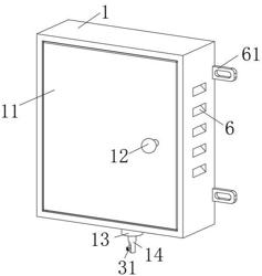 6.如权利要求1所述的一种电力负荷管理配电箱,其特征在于:所述配电箱本体(1)侧壁开设有一对排气孔(6);所述排气孔(6)为对称设置;所述配电箱本体(1)侧壁固接有多个连接片(61)。