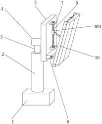 所述调节结构(9)包括位于螺杆(8)外表面的螺纹套(901),所述螺纹套(901)的外表面铰接有调节杆(902),所述固定柱(2)的内部固定安装有驱动电机(903),所述驱动电机(903)的顶部输出轴处固定安装有螺纹杆(904),所述显示屏(10)的上下两侧外表面均固定安装有功能块(905),所述功能块(905)的外表面固定安装有功能电机(906),所述功能电机(906)的输出轴处固定安装有主动齿轮(907),两个所述功能块(905)的外表面活动安装有丝杆(908),所述丝杆(908)的外表面螺纹连接有数量为两个的螺纹块(909),所述丝杆(908)的外表面固定安装有从动齿轮(910),两个所述功能块(905)之间固定安装有滑杆(911),两个所述螺纹块(909)的外表面均固定安装有防护板(912)。
