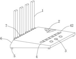 4.根据权利要求1所述的一种具有调节发射功率功能的路由器,其特征在于:所述折叠防撞胶板(4)包括凹型套板(41)、内部套腔(42)和防护橡胶(43),所述凹型套板(41)的上端内侧开设有内部套腔(42),所述内部套腔(42)的内侧位于凹型套板(41)上设置有防护橡胶(43),所述凹型套板(41)连接在发射功率可调路由器机体(6)上。