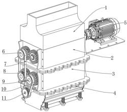 所述粉碎仓(2)的仓斗底部安装有粉碎滤板(12),且粉碎仓(2)的仓斗内部正对于粉碎滤板(12)的上方对称连接有粉碎轴(14),两组所述粉碎轴(14)的轴杆外侧呈对称形式套设有与粉碎滤板(12)相对的两组粉碎辊(13);