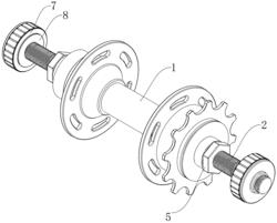 2.根据权利要求1所述的一种自行车飞轮后轴,其特征在于:所述定夹机构(3)包括六个呈环形等距分布于所述抵板(8)外侧的支板(301),所述支板(301)固定安装于所述防护壳(7)的内侧,所述支板(301)的外侧滑动套接有套筒(302),所述套筒(302)远离所述支板(301)的一端固定连接有压块(303),所述压块(303)远离所述套筒(302)的一端固定连接有插块(304),所述抵板(8)的外侧开设有供所述插块(304)限位插接的插槽,所述套筒(302)的外侧固定连接有滑杆(305),所述防护壳(7)的内侧转动安装有调节盘(306),所述调节盘(306)的表面开设有供所述滑杆(305)限位滑动的弧形槽,所述防护壳(7)远离所述抵板(8)的一端转动安装有转筒(307),所述转筒(307)活动套接于所述双向螺杆(2)的外侧,所述转筒(307)与所述调节盘(306)之间固定连接有多个呈环形等距分布的支杆(308)。