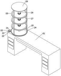 3.根据权利要求1所述的一种可调节的电气故障检测台,其特征在于:所述齿轮二(24)通过通孔和底部存放盘(25)连接,所述齿轮二(24)和底部存放盘(25)的圆心相同,所述推力轴承(26)的顶部连接底部存放盘(25),所述推力轴承(26)的底部连接故障检测台主体(01)。